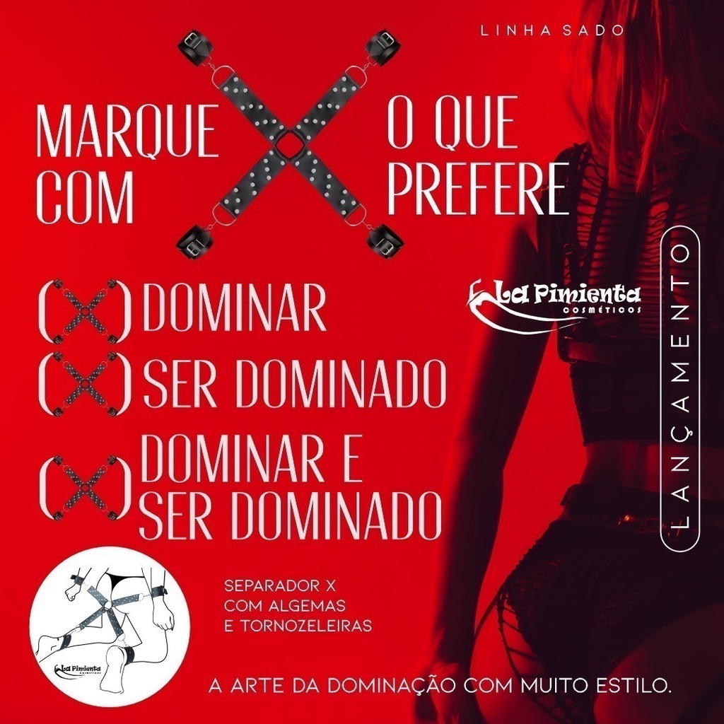 Conheça o SEPARADOR X COM ALGEMAS E TORNOZELEIRAS, o acessório que vai elevar suas experiências de prazer e sedução a um novo nível! Com um design sofisticado, ele é ideal para quem deseja explorar o universo do BDSM com segurança e estilo.